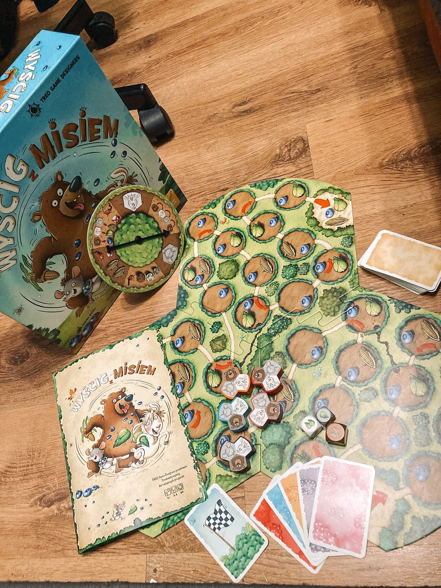 Co ciekawe, jeśli planujecie grać w „Wyścig z misiem” z dzieckiem młodszym niż 5 lat, możecie wybrać łatwiejszą i nieco szybszą formę rozgrywki, która nie zanudzi małego planszówkowicza. Wówczas zamiast kostek i kart używacie zegara, na którym są te same oznaczenia, co na kartach ruchu, jednak nie trzeba rzucać kostką czy wyciągać karty, a wystarczy zakręcić strzałką, która wskaże sposób ruchu lub akcję. Szczerze powiem, że nawet 3 letnie dziecko jest w stanie poradzić sobie z grą przy wsparciu rodziców bądź starszego rodzeństwa.